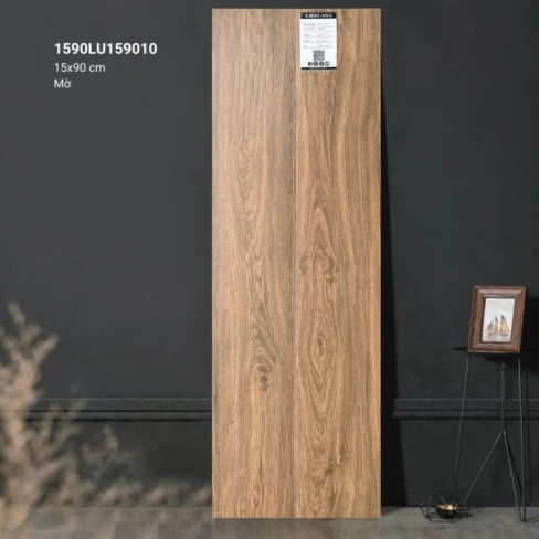 • Gạch lát nền giả gỗ Gạch giả gỗ 15×90 1590LU159010 mang tông màu nâu đậm, đây là tông màu được rất nhiều khách hàng yêu thích khi lát phòng ngủ hay phòng khách theo phong cách cổ điển, bán cổ điển, sang trọng,.