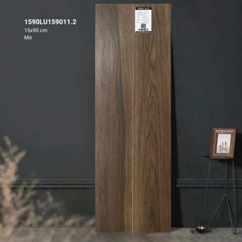 • Gạch lát nền giả gỗ Gạch giả gỗ 15×90 1590LU159011.2 mang tông màu nâu đậm, đây là tông màu được rất nhiều khách hàng yêu thích khi lát phòng ngủ hay phòng khách theo phong cách cổ điển, bán cổ điển, sang trọng,.