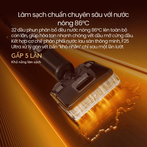 Không chỉ hút và lau thông thường, F25 Ultra tích hợp chức năng phun hơi nước 150°C và sử dụng nước nóng 86°C, giúp đánh bật vết dầu mỡ, vết bẩn cứng đầu mà không cần chất tẩy rửa hóa học. Giải pháp an toàn và thân thiện cho gia đình có trẻ nhỏ hoặc thú cưng.