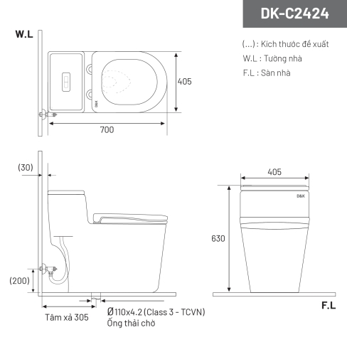 • Tâm xả tiêu chuẩn: 305 mm