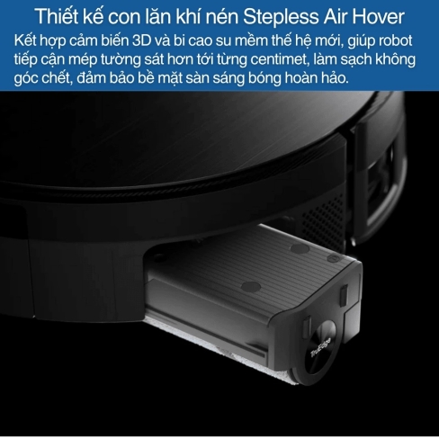 Công nghệ này còn kết hợp thiết kế trống nổi Stepless Air Hoverbi cao su mềm, giúp robot tiếp cận mép tường sát hơn, làm sạch mượt mà và an toàn.